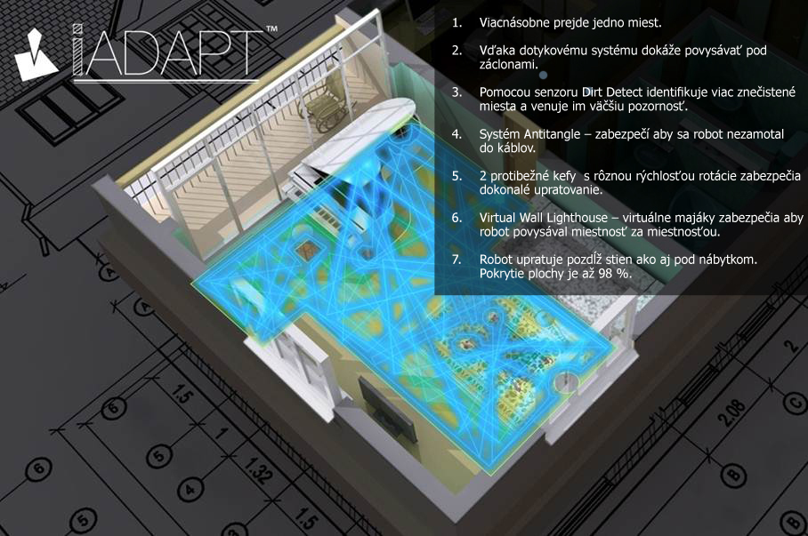 To že robotický vysávač Roomba od spoločnosti iRobot, patrí medzi špičku na trhu potvrdzuje systém upratovania iAdapt. Jeho podstatu tvorí 38 aktívnych senzorov komunikujúcich s programovým vybavením vysávača. Senzory monitorujú čistený priestor 67 krát za sekundu. Roomba informácie spracováva a následne reaguje viac ako 40timi pohybmi . Cely systém je jedinečný v tom, že vysávač prejde po jednom mieste priemerne 4 krát a tým sa zabezpečuje precíznosť a vysoká kvalita upratovania .